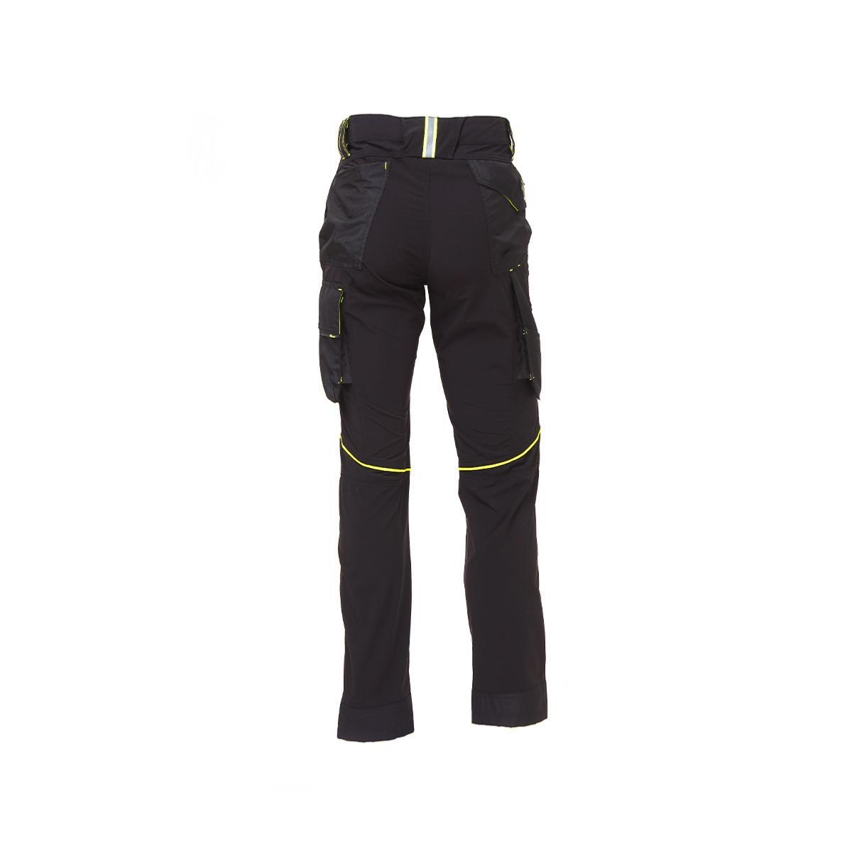 Poche latérale porte-outils, poche latérale multifonction avec porte badge rétractable, deux poches à l’arrière dont une avec patte et une avec fermeture velcro.