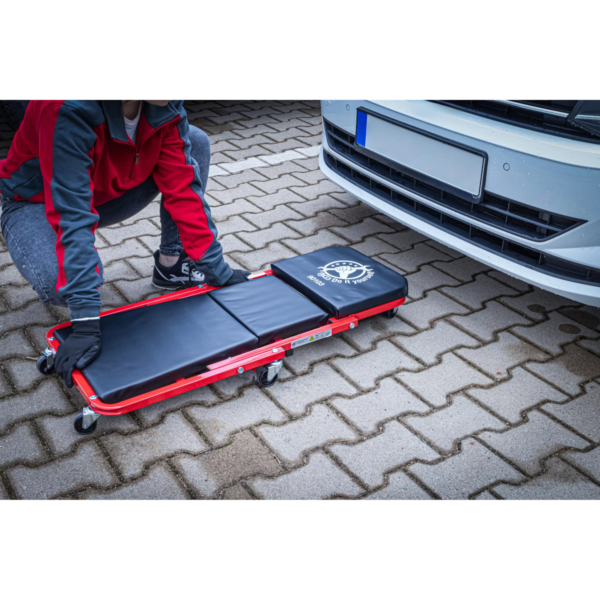 - Assise confortable avec coussin en mousse pour un travail sur et sous le véhicule.